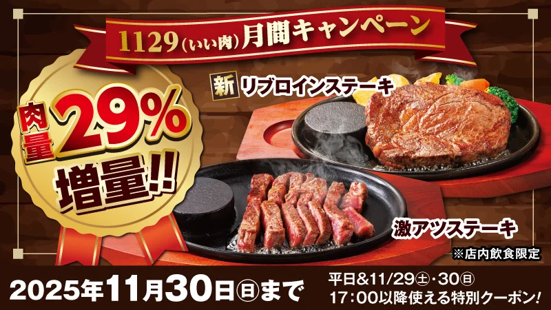 2025年11月29日は、肉量29%増量キャンペーン実施。